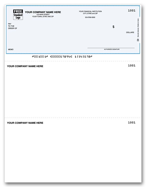 A. Any checks that are compatible with DELUXE check numbers DLM102 or DLT104 are compatible with TKT Payroll. You can review them online at www.deluxe.com by entering each number in the "Enter Search Keyword" box and clicking the "SEARCH" button. When the product page appears, double click the check picture for a larger image. A laser printer is not required to print the checks. The TKT Payroll software does not print the company name, address, or bank routing codes, etc. on the checks. That information will be added when you order the checks from DELUXE. The software prints the date, dollar amount, employee name and address on the check, plus current and year-to-date earnings, taxes, and deductions on the check pay stub.